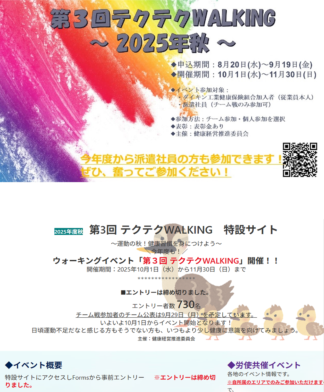 歩数を競い合うウォーキングイベント「テクテクWALKING」を開催しています。「テクテクWALKING」は社名である「ダイキンエア”テク”ノ」と「”てくてく”歩く」が由来となっており、従業員の運動習慣を高めることを目的として、期間(5月、10~11月)を設けて実施しています。
